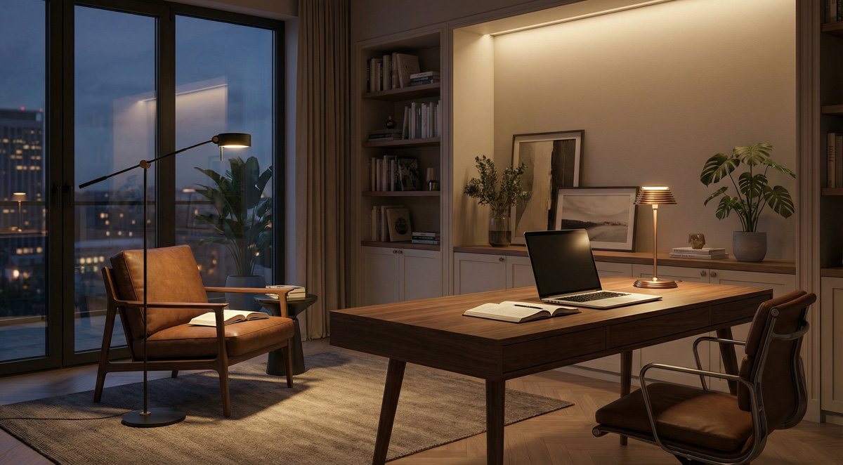 Screen glare is a design flaw, not an inevitability. By utilizing diffused ambient light, task lamps, and wall-washing techniques, you can create a perfectly illuminated, reflection-free environment.